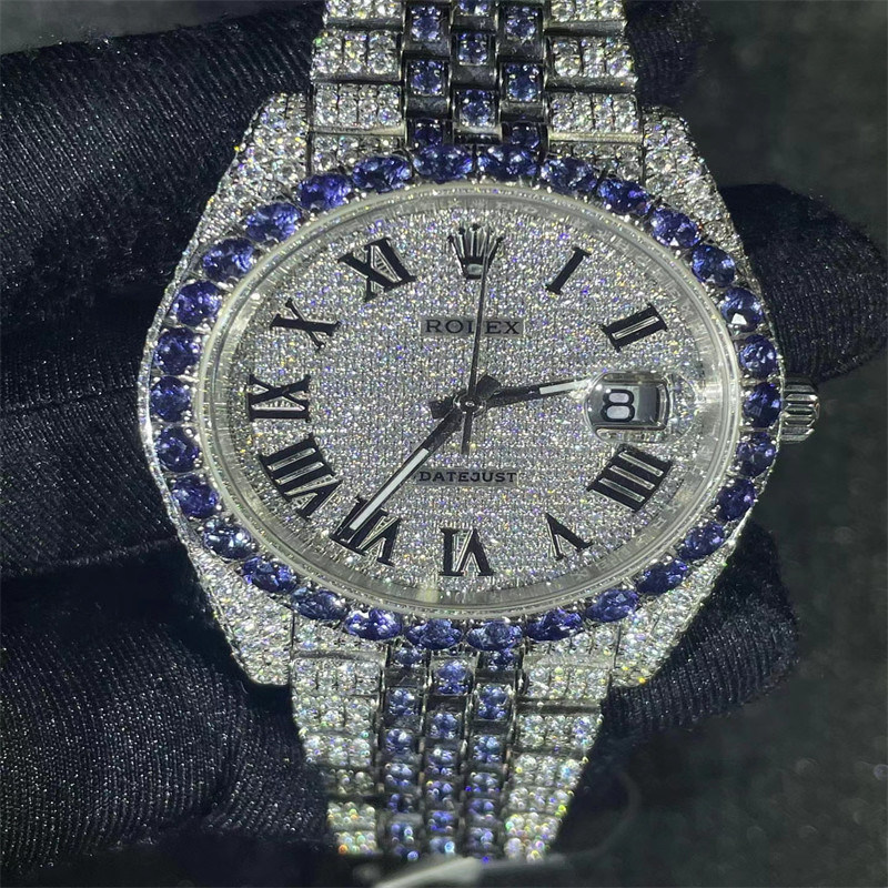 고급 블링 보석 가득 찬 다이아몬드 다이얼 시계 VVS 모이산니트는 시계 모이산니트 시계 로렉스 바깥쪽에 얼렸습니다